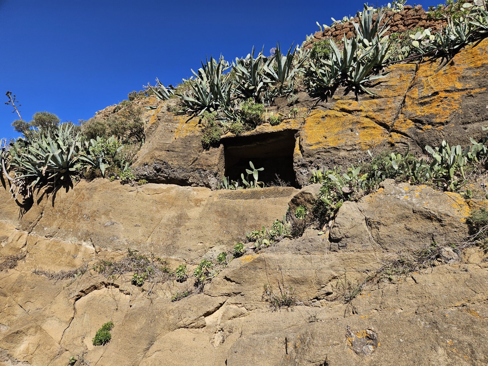 Our first stop was at the local church, a quaint introduction to Las Carboneras. The trail began with a climb up rocky stairs, rewarding us with panoramic views of the village and a distinct roque emerging from the mountain ridge, resembling a miniature church dome.  Walking along the hillside path, surrounded by vibrant yellow flowers, we couldn’t help but feel like spring was there, despite the calendar showing January 3rd. The fragrant air and picturesque scenery made the hike even more enjoyable.