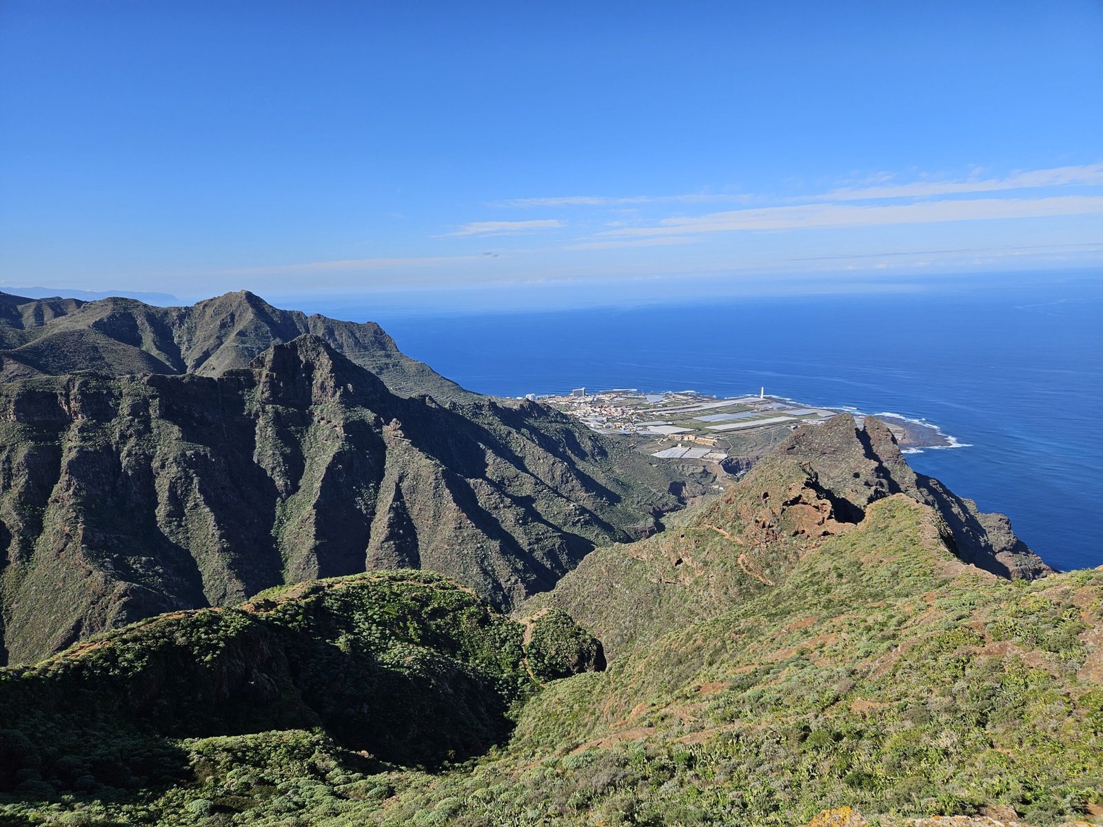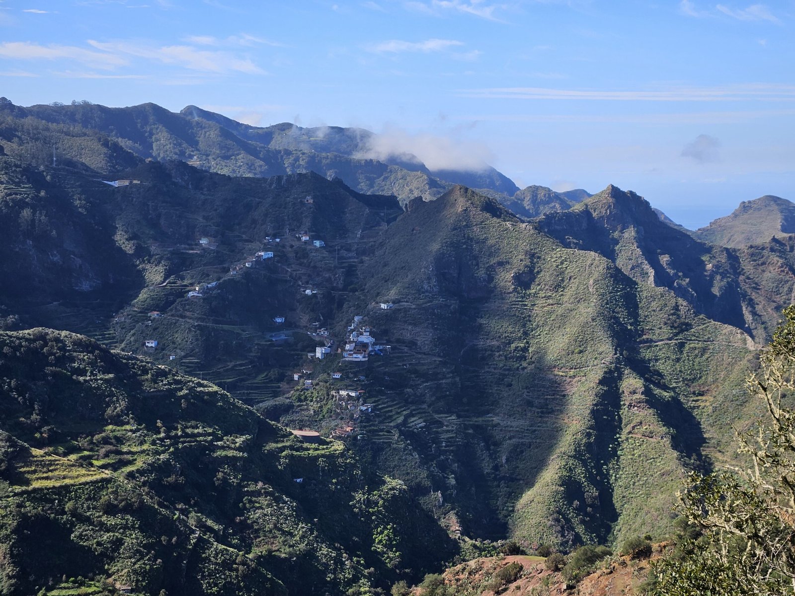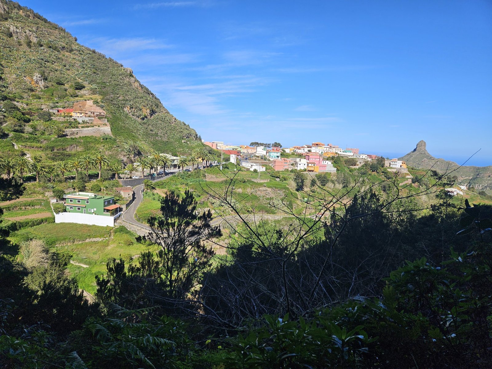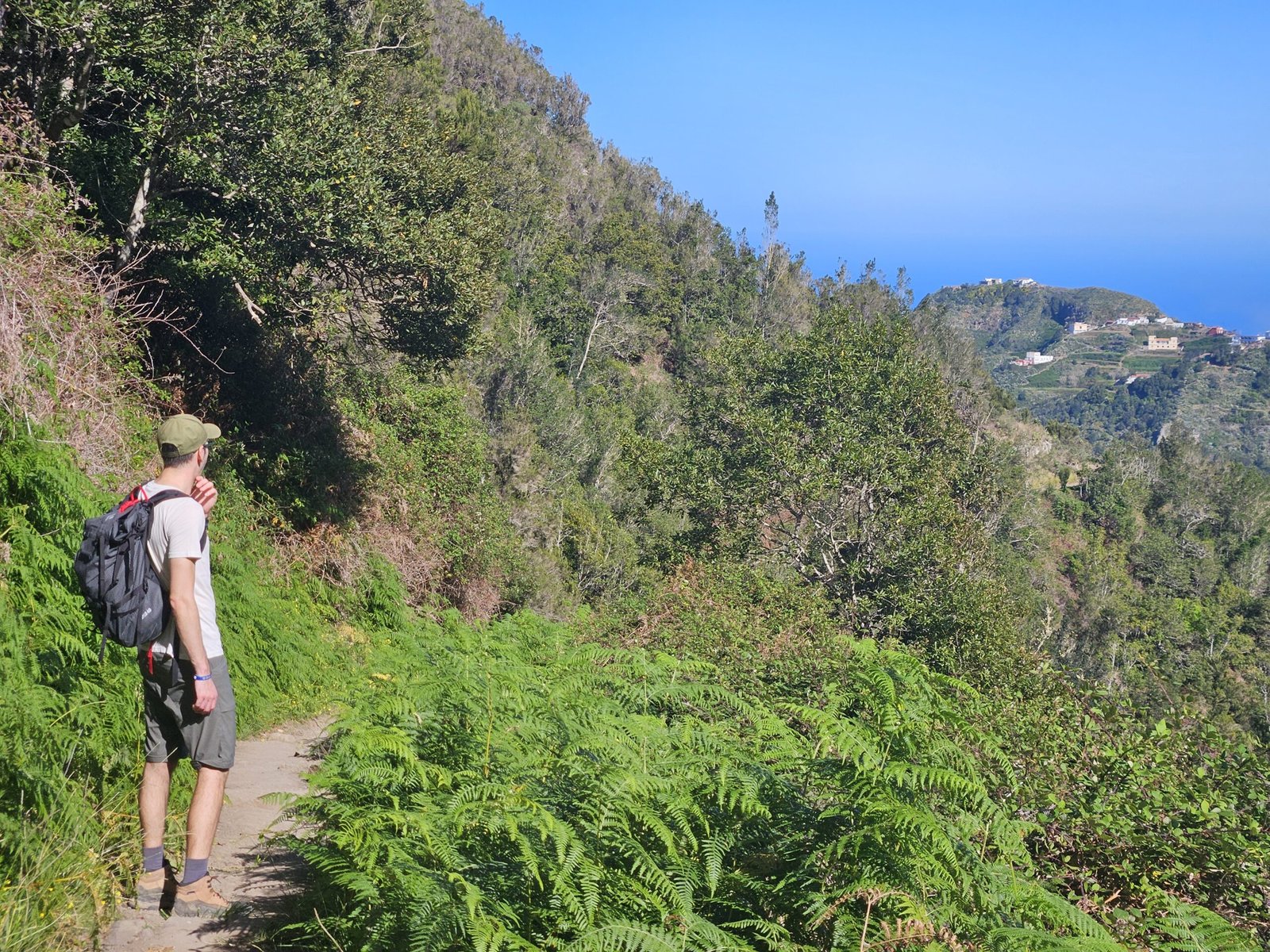 The return journey to Las Carboneras unveiled an even more diverse landscape. Wandering through laurel forests, bushes, and ferns, the picturesque trail offered a dynamic mix of shade and sunlight. The ever-changing scenery provided a welcome contrast to our tired legs from the previous day’s mountain climb to Guajara. Passing a small farm with sheep and chickens, the trail continued its undulating pattern. After another turn on the trail we were in awe from yet another breathtaking viewpoint with ravines, mountain ridges, and a picturesque village on the other side.