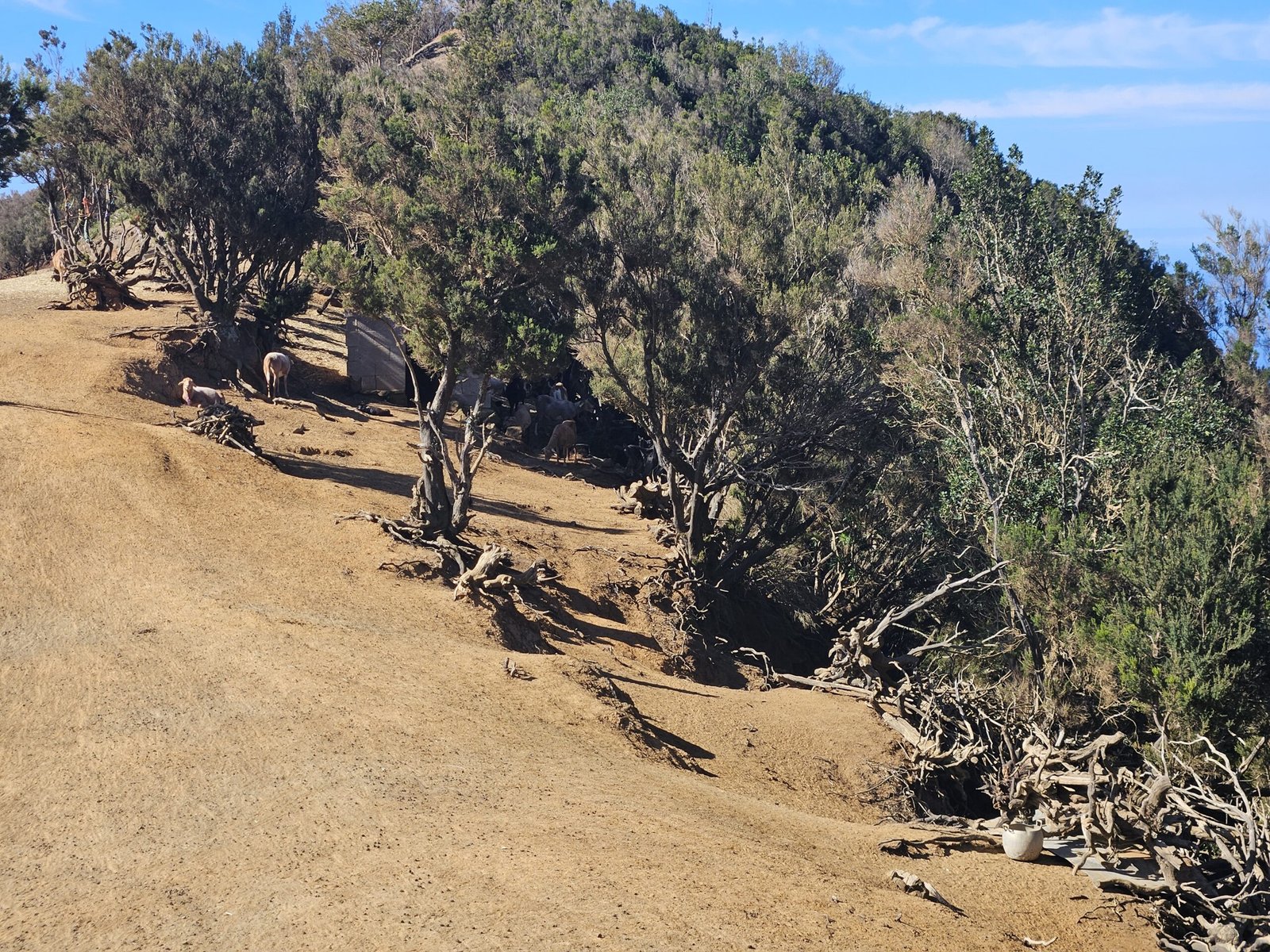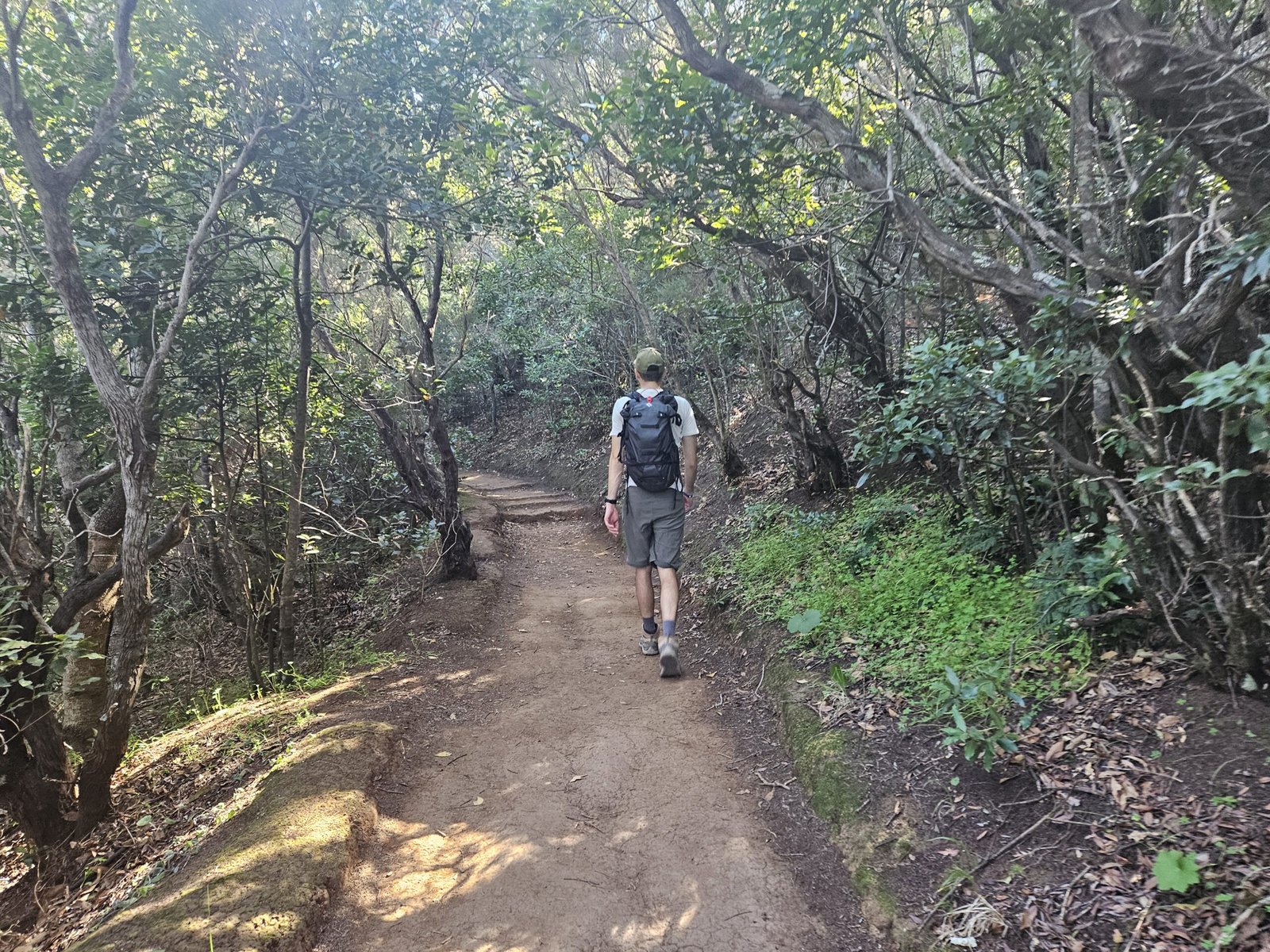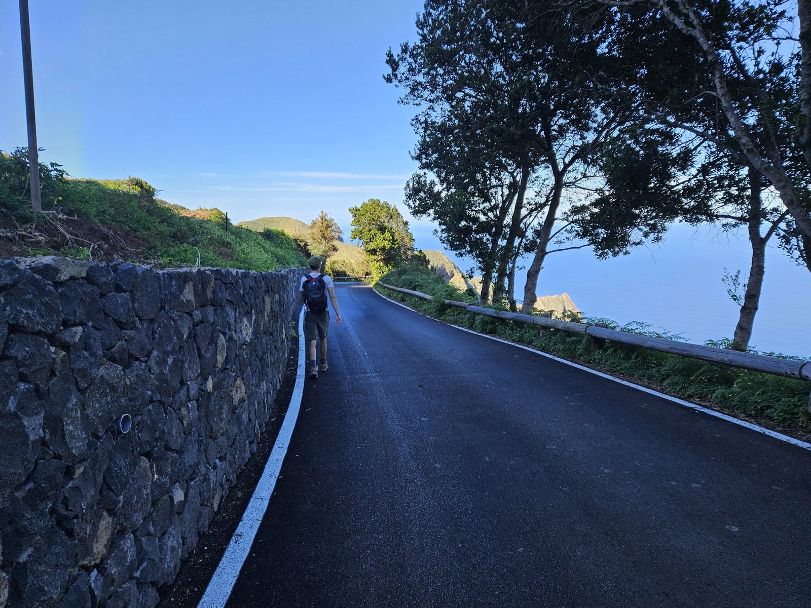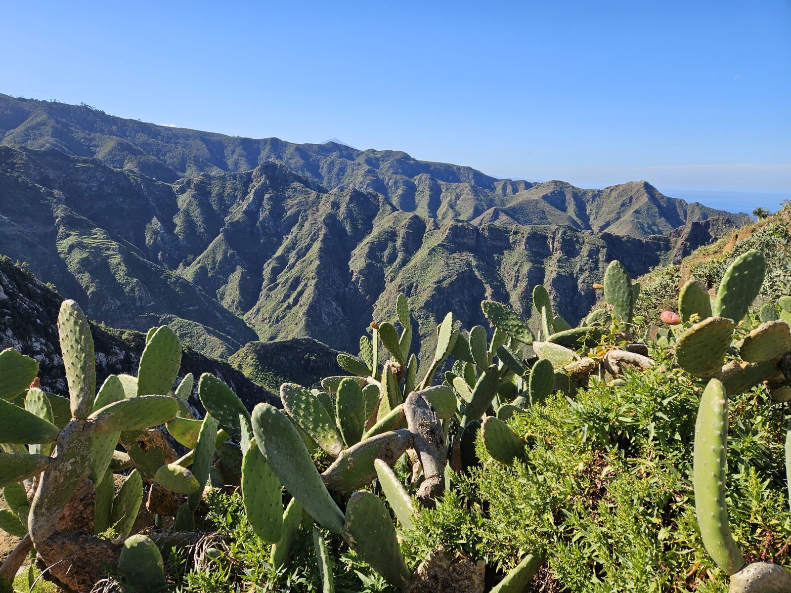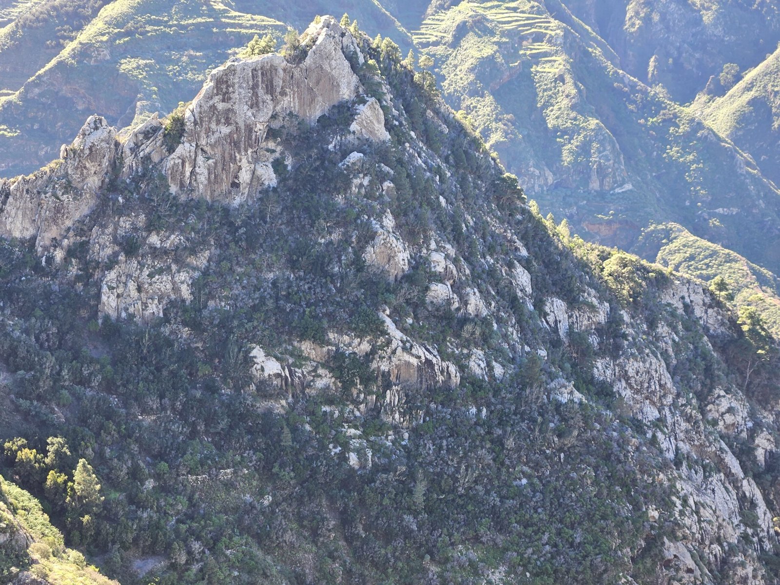 The return journey to Las Carboneras unveiled an even more diverse landscape. Wandering through laurel forests, bushes, and ferns, the picturesque trail offered a dynamic mix of shade and sunlight. The ever-changing scenery provided a welcome contrast to our tired legs from the previous day’s mountain climb to Guajara. Passing a small farm with sheep and chickens, the trail continued its undulating pattern. After another turn on the trail we were in awe from yet another breathtaking viewpoint with ravines, mountain ridges, and a picturesque village on the other side.
