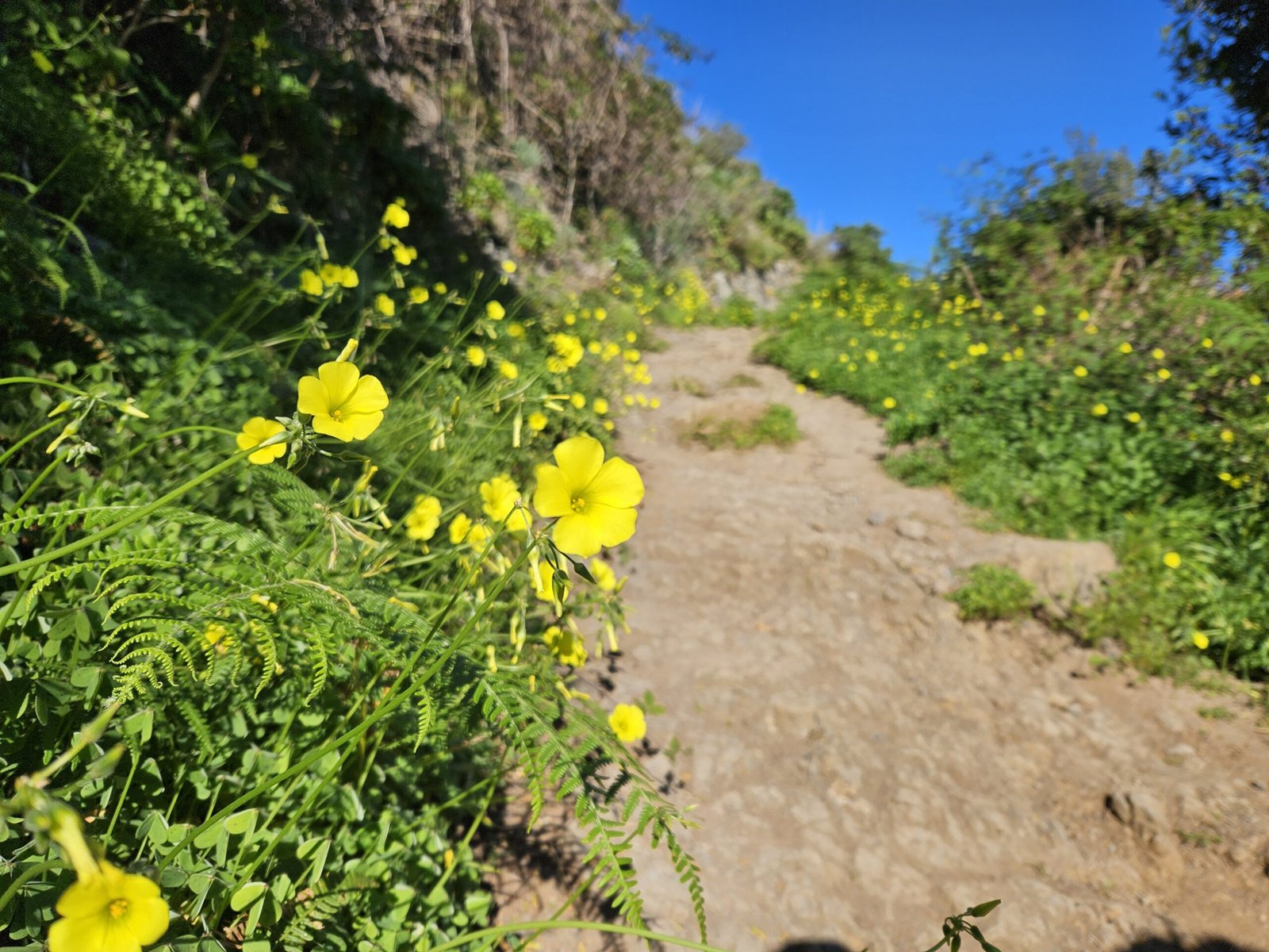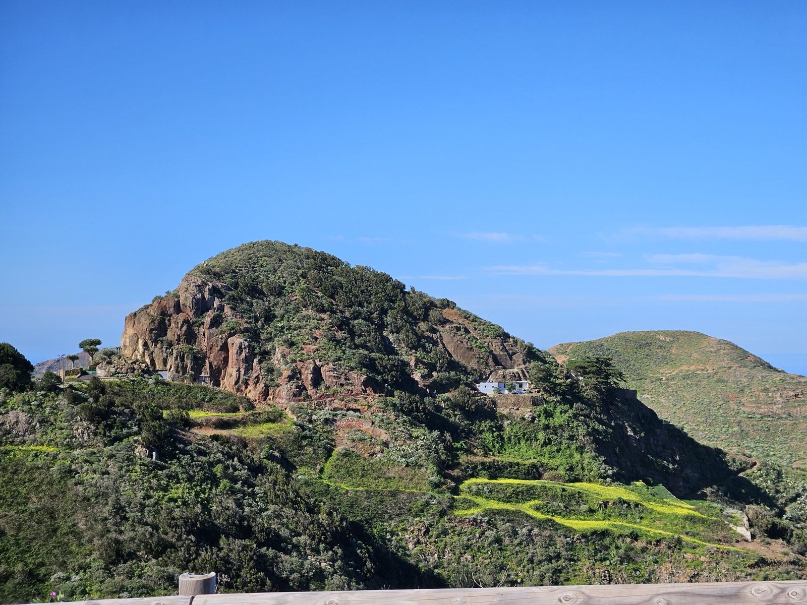 As we ascended along Chinamada’s hill’s edge, the majestic Roque de Los Pinos appeared before us, a colossal rock adorned with Canarian pine trees. Beyond, the majestic silhouette of Mount Teide graced the horizon, standing majestically against the canvas of the Tenerife sky. On the opposite side, Chinamada revealed itself amidst cliffs, terraced hills, and a golden field of yellow flowers. The climb to Aguaide’s peak rewarded us with a sprawling view, embracing the town of Punta del Hidalgo and the vast ocean. After soaking in this breathtaking panorama, we retraced our steps to Chinamada. Taking refuge in the shadow of the village church, we enjoyed a well-deserved lunch (the sneaked sandwiches from the morning buffet), surrounded by echoes of the ocean and the song of birds.