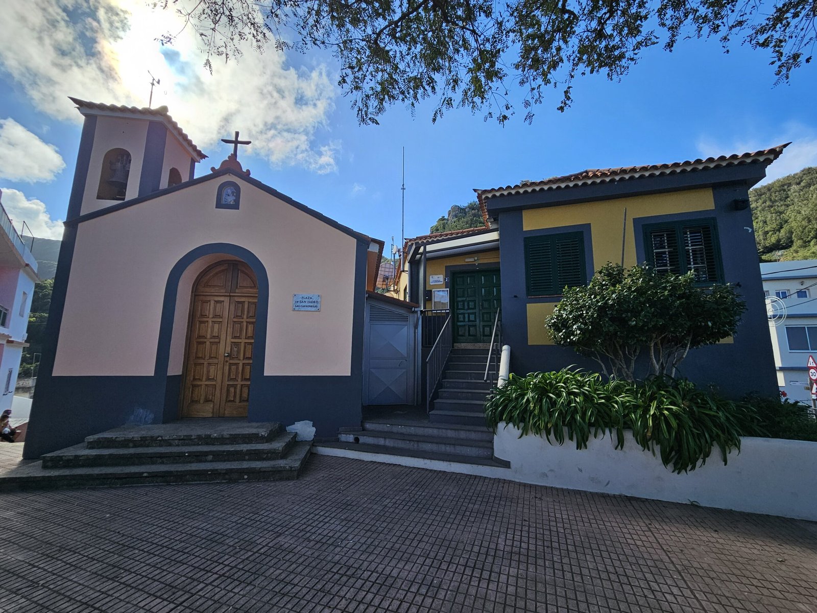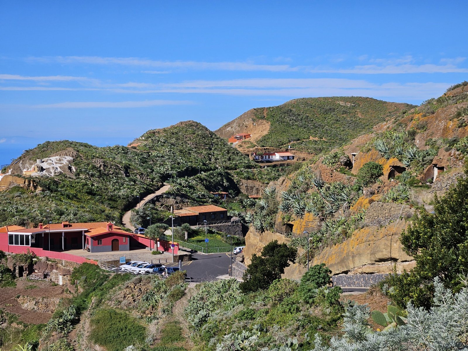 Driving out of the resort proved slightly challenging with the myriad of roundabouts and zigzagging road network. The island is renowned for its abundance of turns and zigzagging streets. However, after a bit of confusion, we successfully navigated our way to the highway heading east towards Las Carboneras. The highway drive was a treat itself, as we passed by the breathtaking coastal cities and eventually reaching Santa Cruz and La Laguna. A turn onto a narrower pathway, zigzagging and with many turns, covered by a tunnel of trees, transported us to the tiny village of Las Carboneras, perched on a hill with cozy little houses spread around.