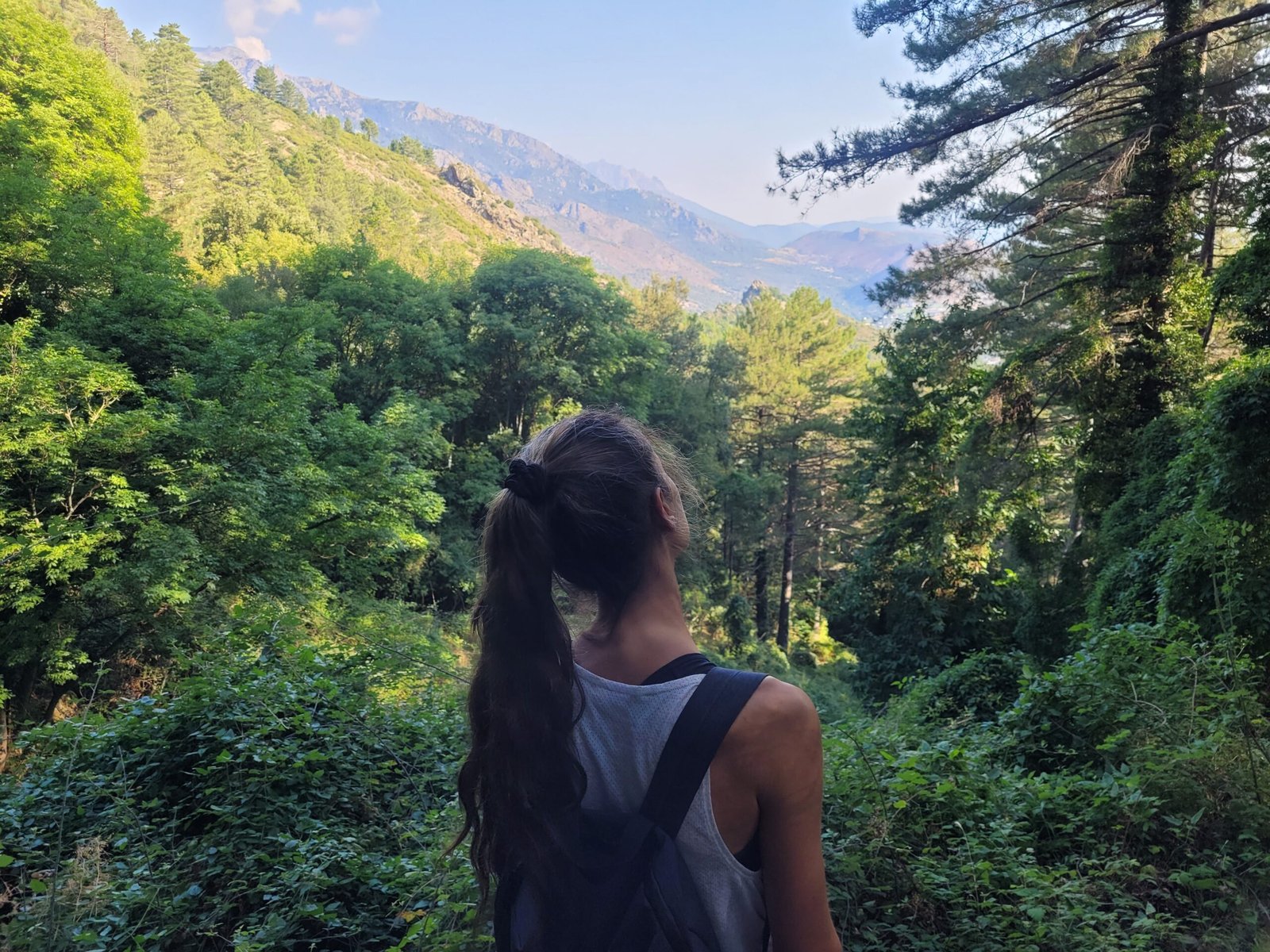 Although we didn’t make it all the way to the very top due to time constraints and an approaching thunderstorm, we still reveled in the beauty of our surroundings. We decided to stop at a water source flowing down the hill, where we found a perfect resting spot to take in the scenery before beginning our descent back to Corte. We only saw the top of the peak from beneath, but it was majestic.