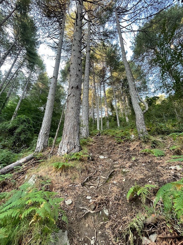 Climbing to Punta Cisterna was a bit more challenging, and we took our time, pausing to admire the majestic sights along the way, but mostly to catch our breath. The dense forest provided a stark contrast to the rocky terrain with less trees and more bushes we saw at La Pointe du Corbeau. Towering pine trees and lush greenery surrounded us as we got closer to the peak.
