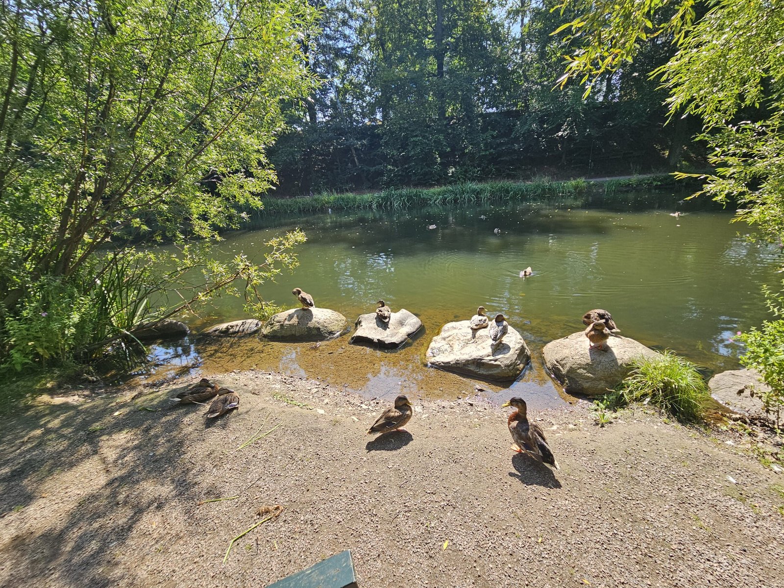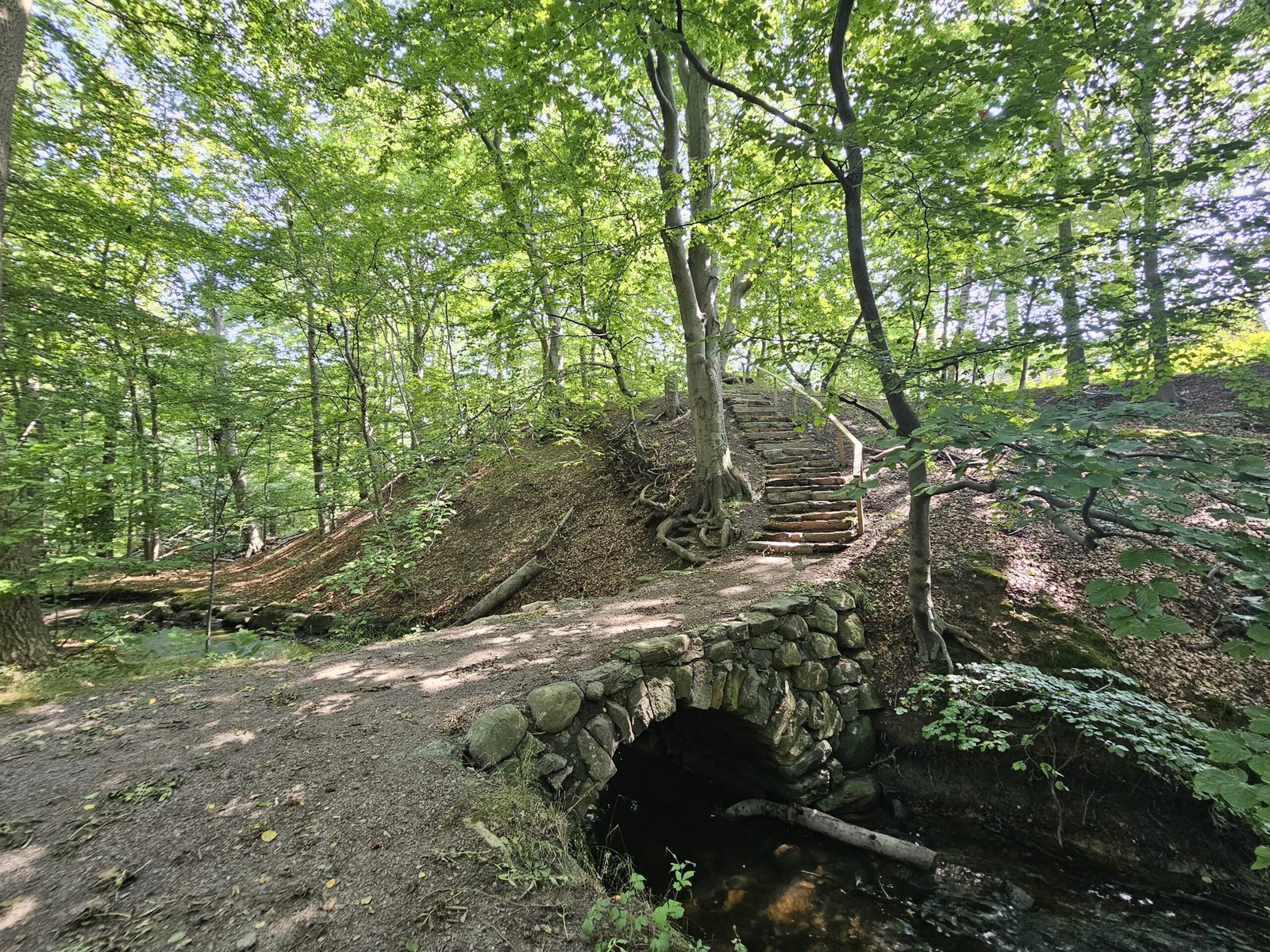 The city streets led us to a sprawling park, the first taste of greenery on our urban first stage of the hike. The sun painted the sky a brilliant blue as we wandered through the cozy streets of the sweedish town of Helsingborg. Not long after, we found respite from the warm city streets in the embrace of Närlunda park, a true gem nestled beside a beautiful lake occupied by ducks and fish. But alas, the park’s allure was fleeting, as we once again ventured into the cityscape, our spirits unfazed by the heat. It wasn’t long before another park welcomed us, Ramlösa Brunnspark, providing a refreshing atmosphere along the river’s edge. As we walked on the dusty pathway or crossed woden planked brigdges, at the end of the park we had a glimpse into the city’s storied past through displayed vintage photographs. As we learnt later, apart from Christmas, midsummer is the most important holiday in the Swedish calendar and in this park they made sure to celebrate this properly.