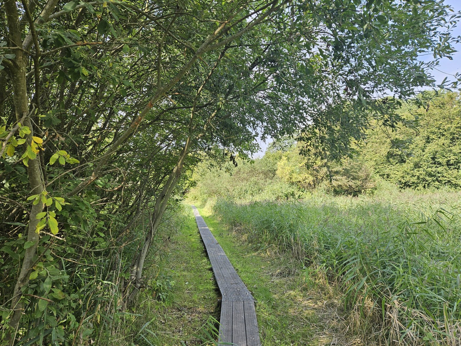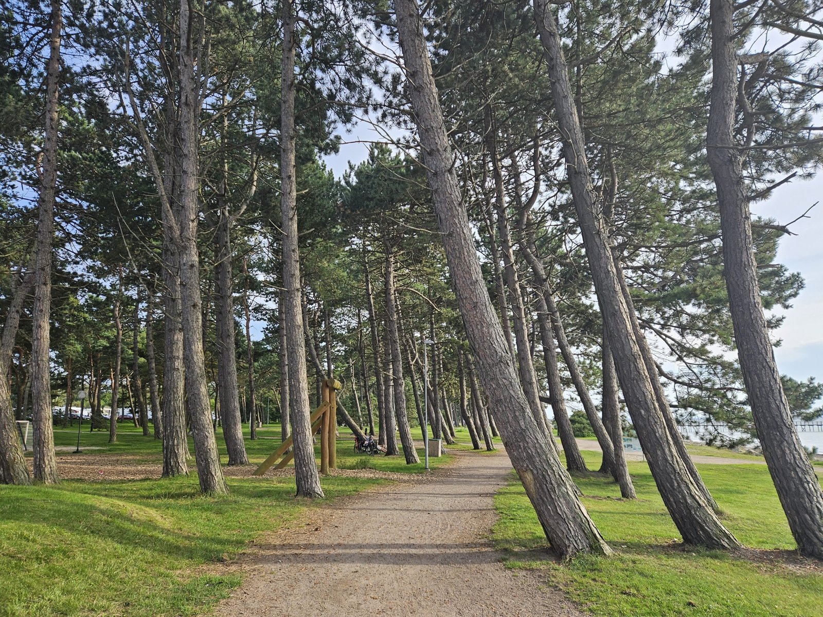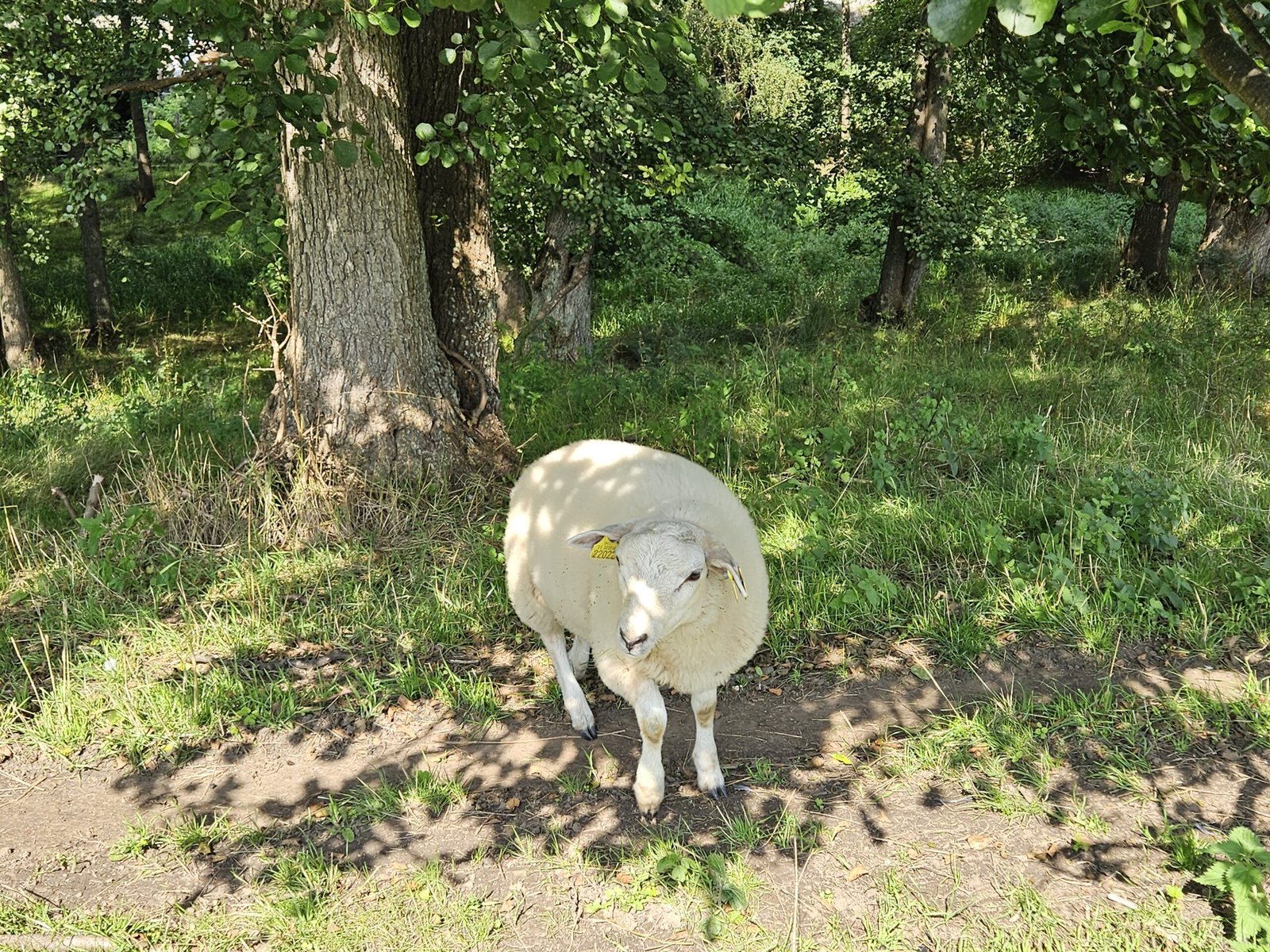 After a while we found ourselves passing close to the river, which was a delightful shift in scenery after a familiar urban stroll and even crossing of railways. This stretch of the route we will remember with both the picturesque summer houses on one side and the playful and loudly bleating sheep on the other. Among them, one sheep came even very close to the fence and wanted to be pet. Amidst patches of sunlight and shade, the journey continued past residential pockets, leading us towards Örby Park. This park’s pathway led us through lush grass sections that eventually transformed into a wooden planked trail, creating a fine contrast to the previous surroundings. The tantalizing scent of the sea teased us as we neared the end of the park, and finally, the coastline revealed itself – a majestic expanse of blue and a haven for beachgoers.
