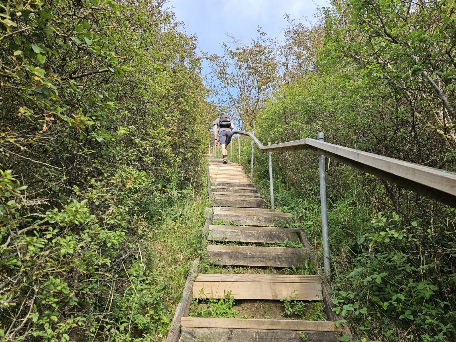 One memorable stretch of our journey led us through a picturesque field where curious cows grazed peacefully. As we paused to capture the scene, a lighthearted mishap happened, and I found myself tumbling to the ground, and discovered that I am with grass-stained knees. We laughed it out and undeterred, we pressed on, ascending to face our first challenge: a series of steep wooden stairs. While their appearance momentarily daunted us due to fatigue and a lack of shade, we managed at the end to get on top without so much efforts.