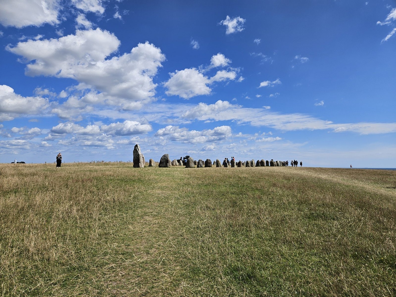 Refreshed and with full bellies, we continued our hike, opening and closing gates, and ascending and descending hills. Our first major highlight was Ales Stenar (Ale’s stones), a 1400-year-old monument resembling a ship’s foundation made of 59 large stones. The site was bustling with tourists, locals and families and children, who playing hide and seek among the stones. We even spotted a small falcon hovering in a hunting position, a mesmerizing sight.