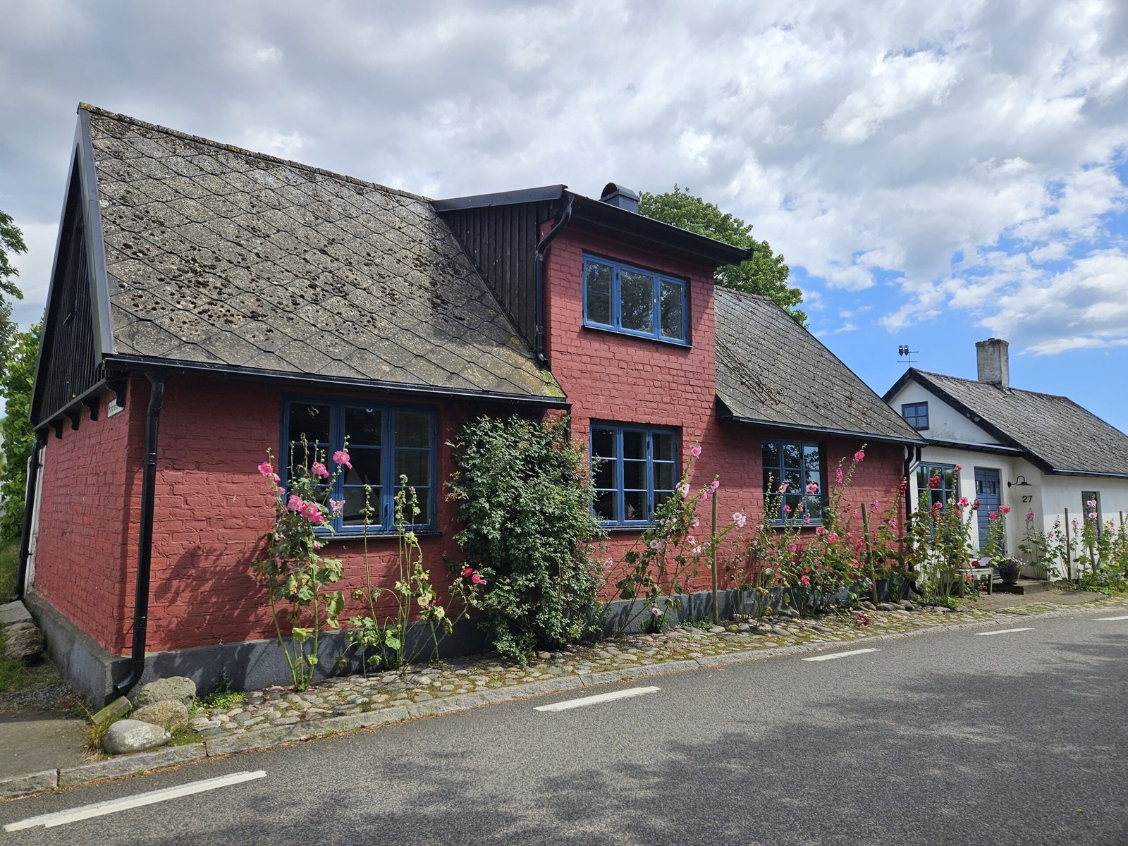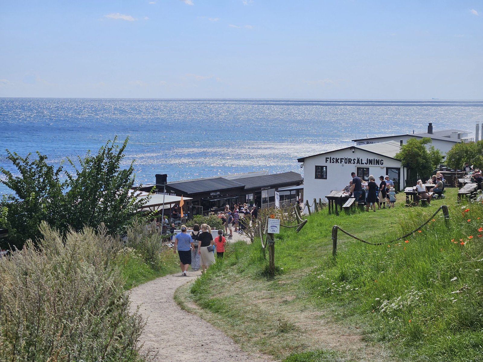 Descending towards Kåseberga, we followed the SL4 markings through a throng of tourists. The circular harbour of Kåseberga, filled with boats, came into view, and we were surprised by the number of cafes and restaurants bustling with people. We were already tempted by the ice cream, but we decided to explore the village first. Kåseberga was quiet as most people were at the harbour. The village turned out to be also very cozy and with colourful Swedish houses adorned with flowers.