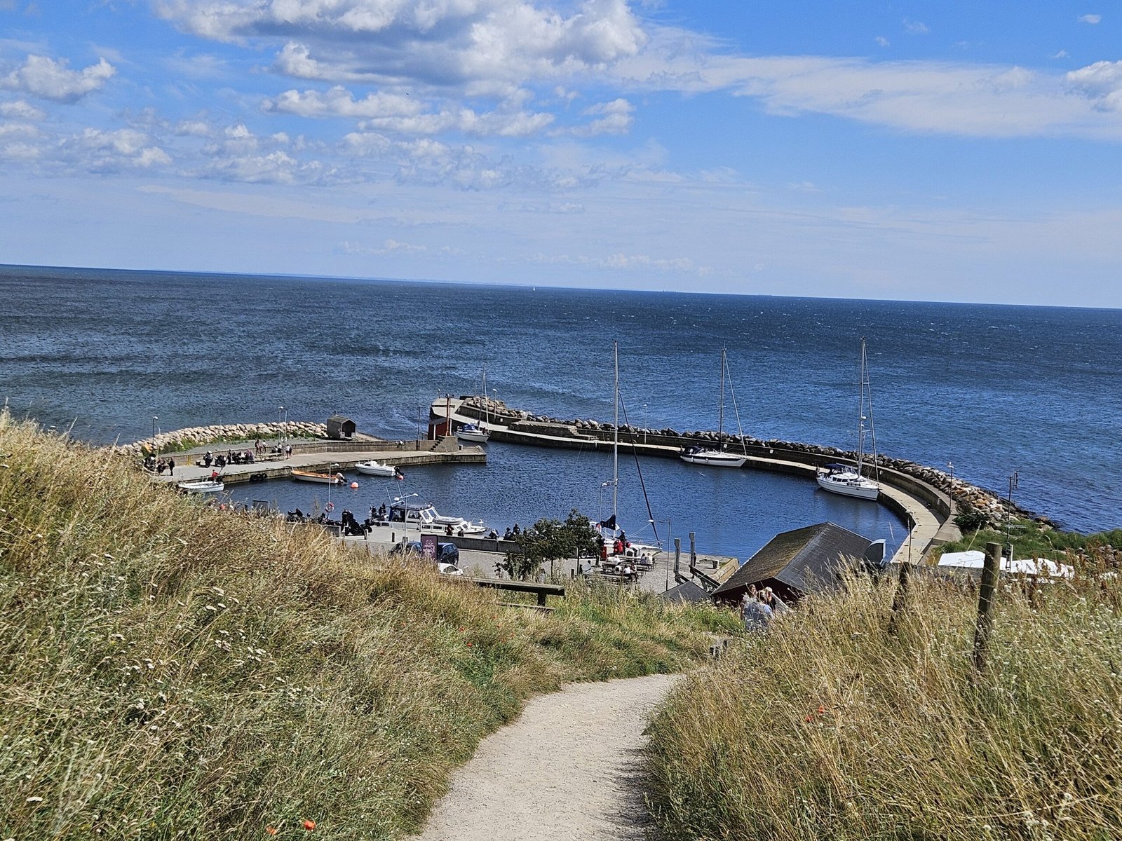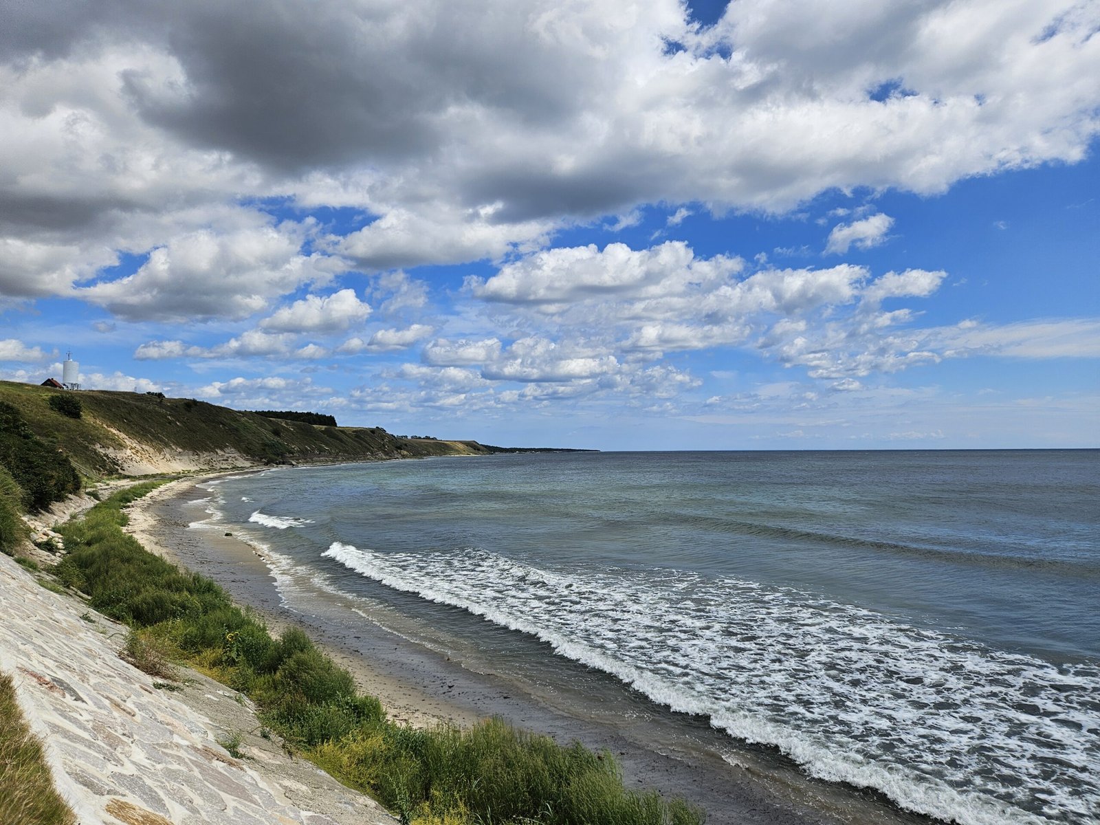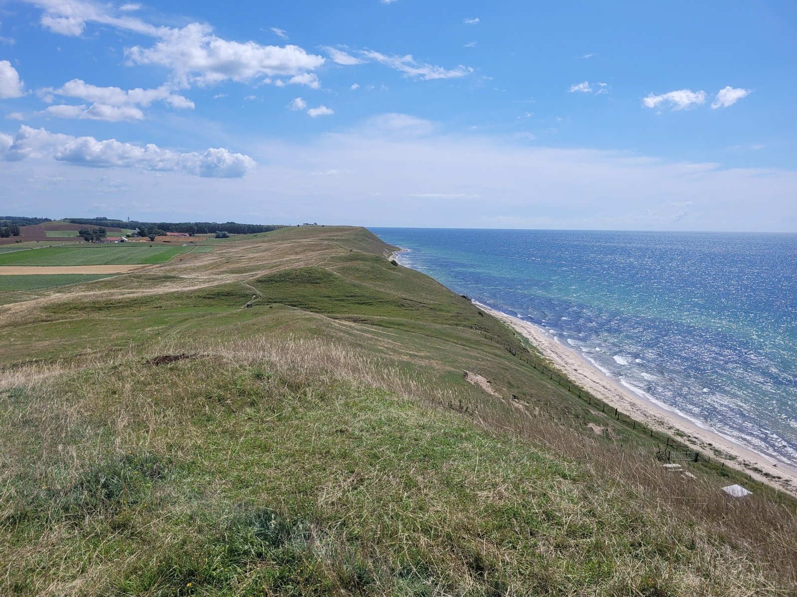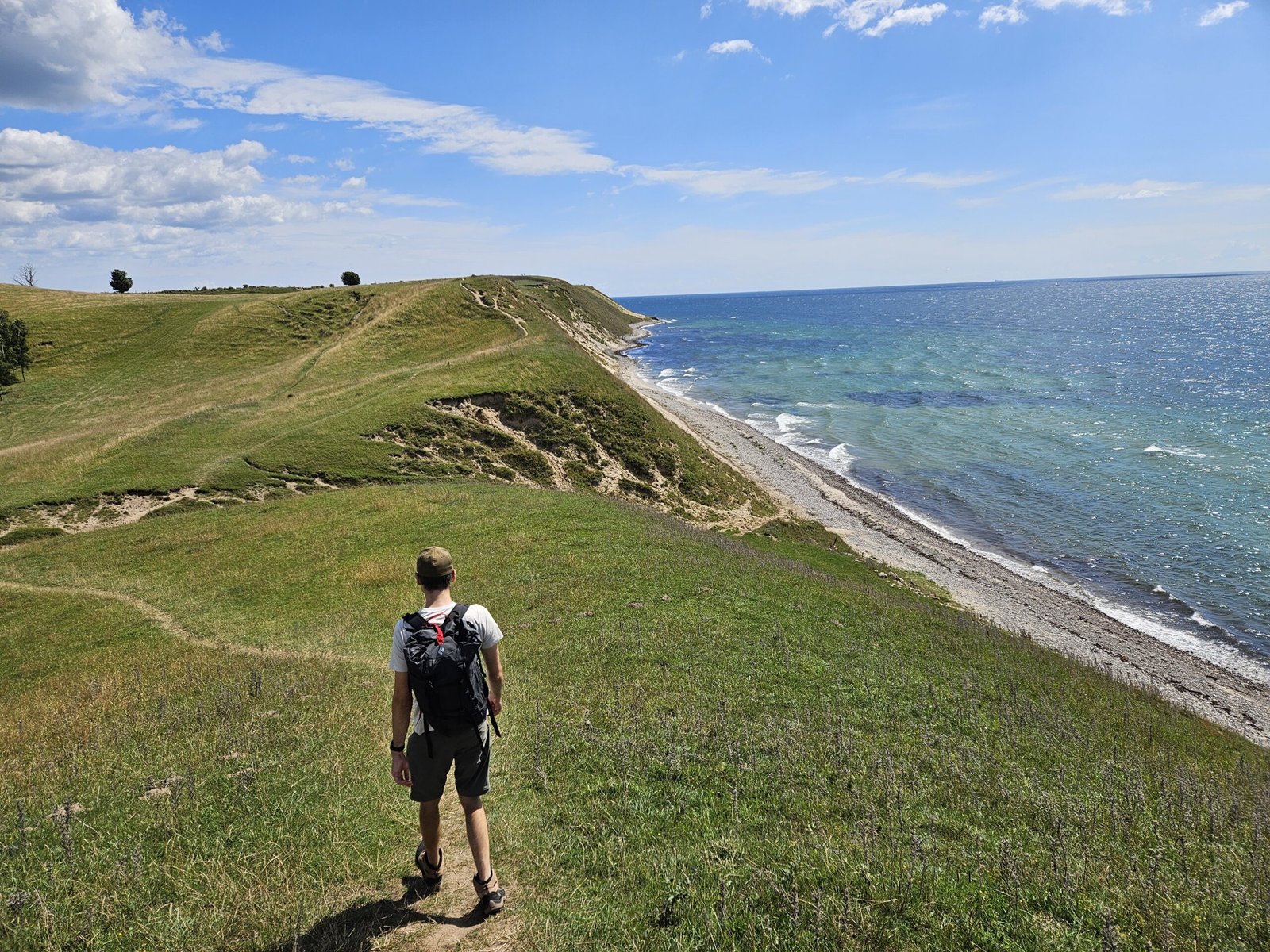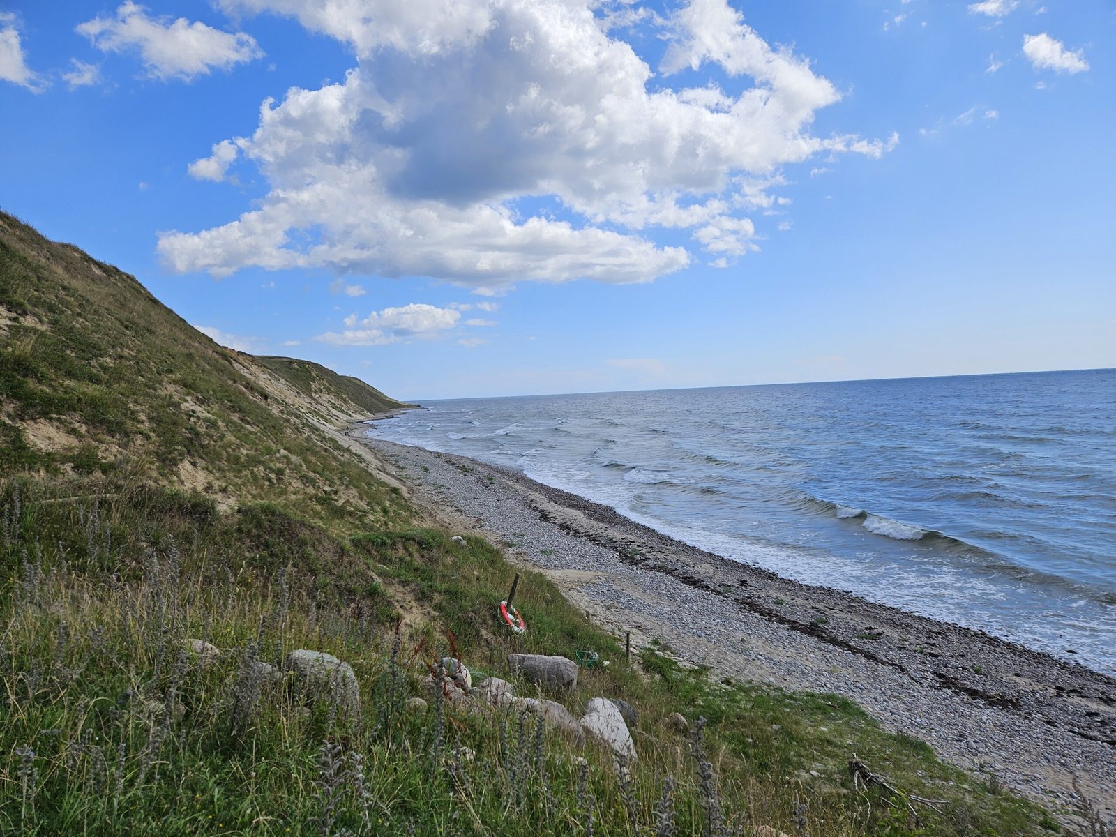 Around 1 pm, hunger set in, and we found a perfect spot between two hills overlooking the water. As we enjoyed our sandwiches, we watched the Bornholm ferries departing from Ystad, not far from our lunch spot. Cozy and warm memories of Bornholm, where we got married in June 2024, flooded our minds.