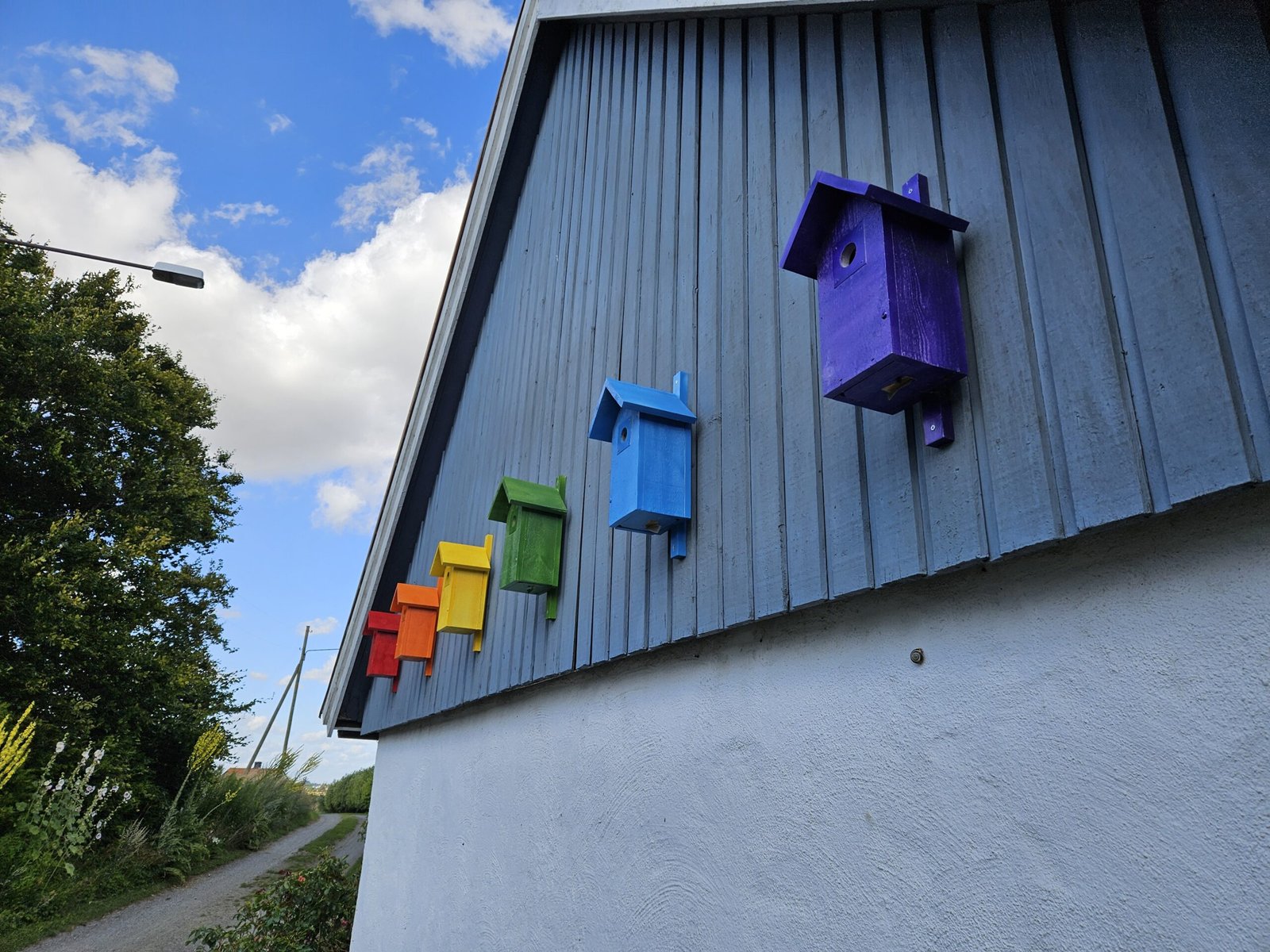 Continuing on a gravel road towards the coastline, we walked past charming houses in Hammar, including one creatively adorned with rainbow-colored birdhouses. Signs warned us that we were near a military area, but the tall grass and narrow path ahead seemed more inviting.