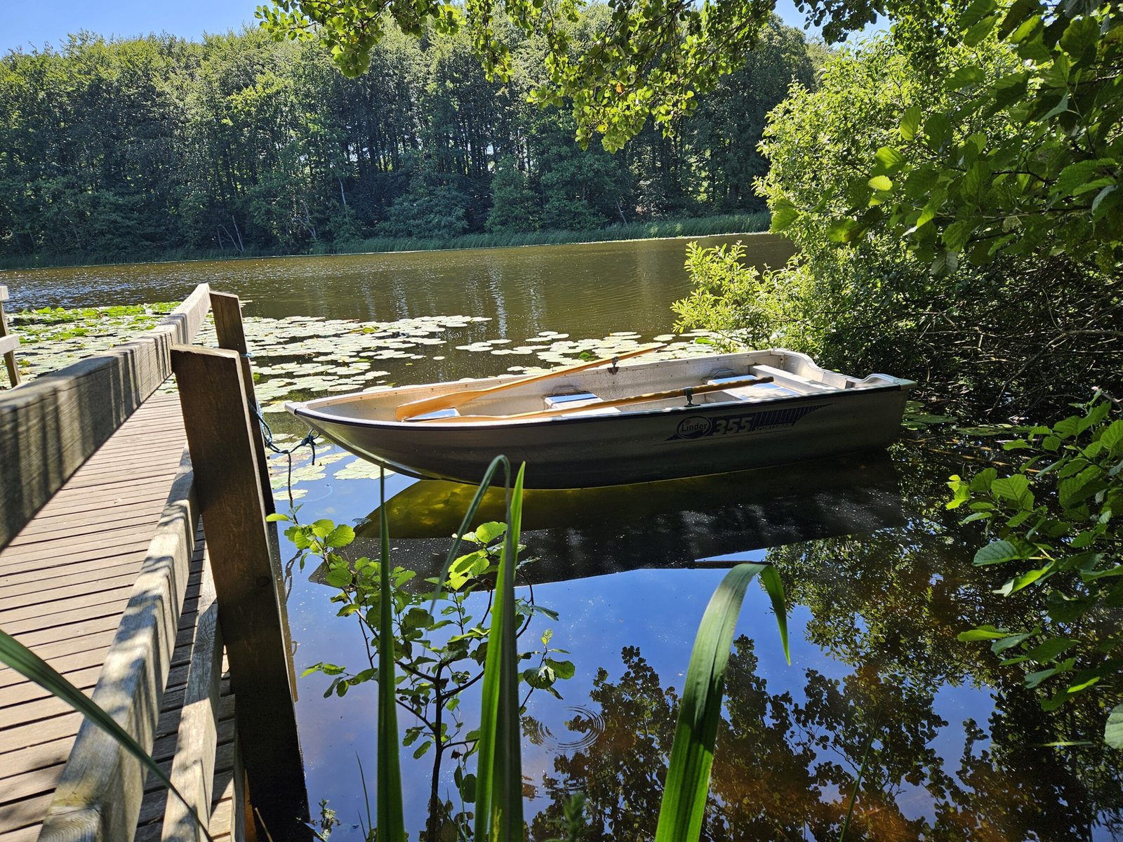 Walking along this part of the hike was easy and pleasant up until we had to pass alongside the dusty gravel road shared with cars. As we were passed by few cars that kicked up dust, we were eager to escape the dusty road and we took the first turn leading us away from this road. Not far from there we discovered the beautiful Store Geddesø, a lake surrounded by lush greenery and a little boat making the perfect picture. Skirting Camp Møns Klint, we continued on our path, noting signs for official trails and one pointing towards Aborrebjerg.